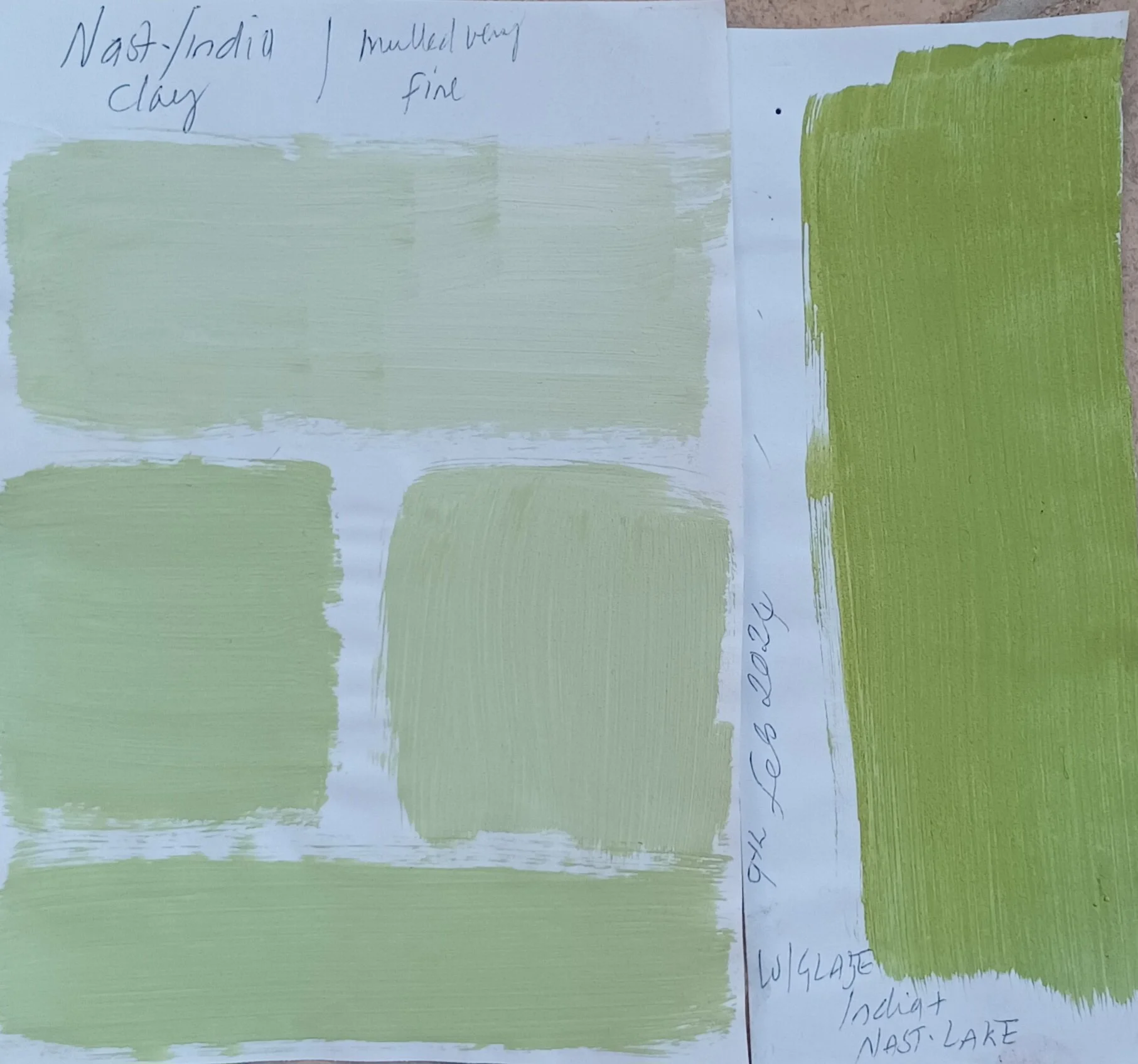 The reason my green pigment might be lacking is perhaps due to it not been cleaned thoroughly. Aparently to get all the yellow ochre and other particles out, it needs to be chemically washed….