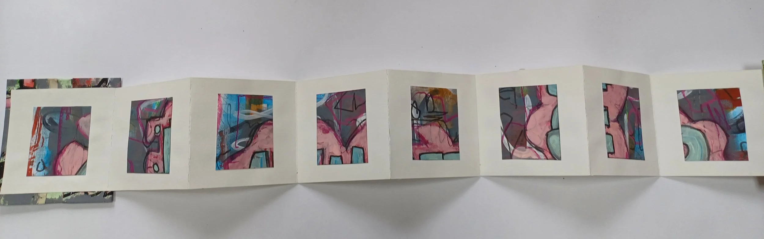 As for my own stuff, I was staying in a very small room and my life became tiny and hyper-focused! I created these very small concertina booklets, as big sheets of paper wouldn’t fit in the room and these would be easier to carry around in suitcases. I set about looking at how some of the graffiti was made , and zeroed in on some micro detail to make up this series of tiny pictures which are only 5cm x 7cm. love the bold colours and clearly defined shapes
