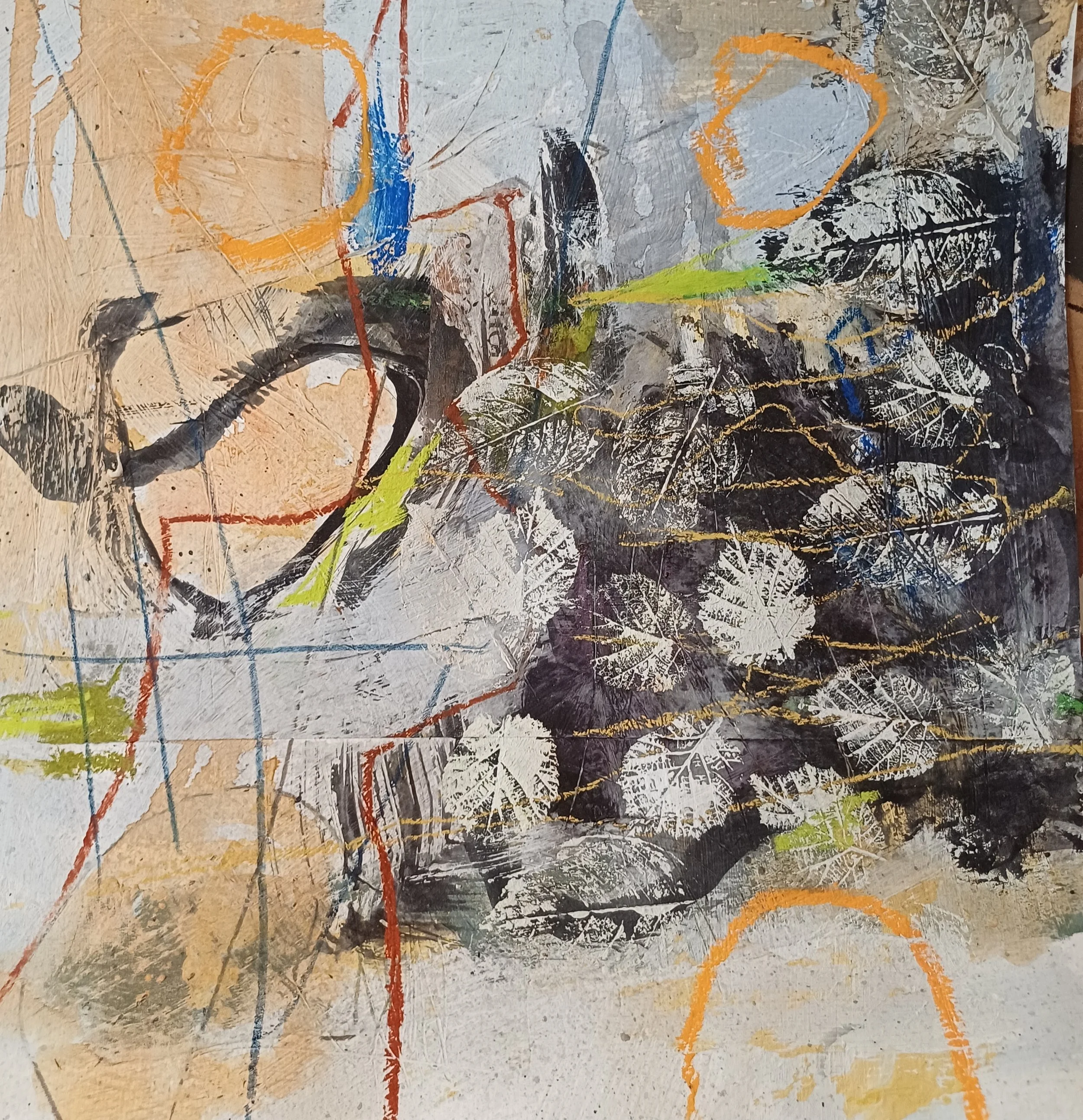 The key to layering in my art practice is to make my own collage material-this not only provides me with interesting and unique stuff to play with but is a really great thing to do when I am feeling stuck, have no ideas, or I am bogged down in the middle of a painting-often inspiration happens in this process of having fun and not worrying about expectations. I get to truly play, and experiment with monoprint, stenciling, and various paint applications. One of my favourite things is printing on dressmakers pattern tissue Fashion design and patterncutting was a big part of my life for many years so I have an endless supply. I also keep all my old paintings and experiments-there are gems in there that can be torn up and used as interesting collage material-no painting is ever a waste of time!